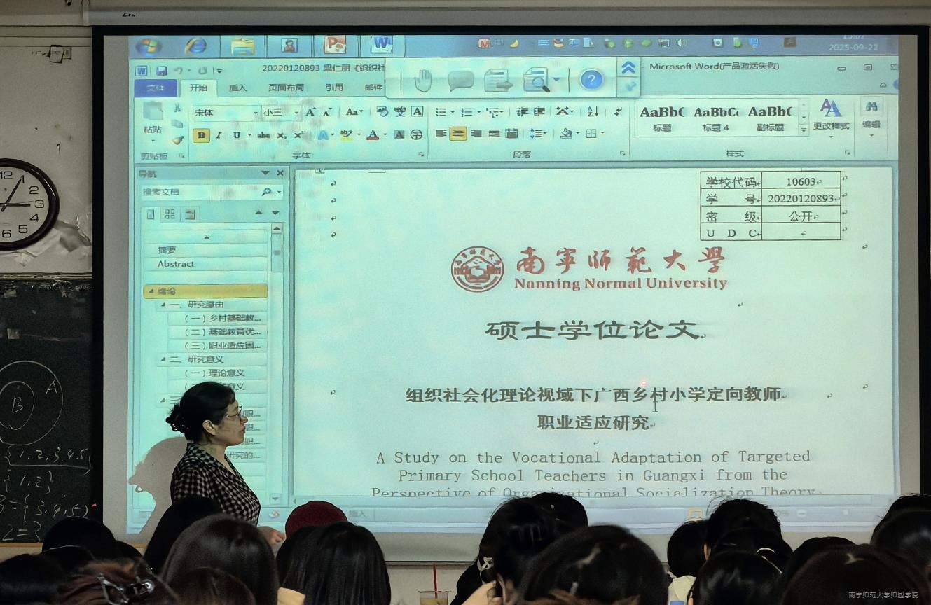 为稳步推进毕业论文工作的各项环节, 9月23日,教育系在教学楼2-101教室为小学教育专业2026届专升本学生开展了一场关于“2026届师范生论文写作规范与指导”的讲座。南宁师范大学熊孝梅教授应邀主讲。教育系副主任龚雪及教师代表一同参与。