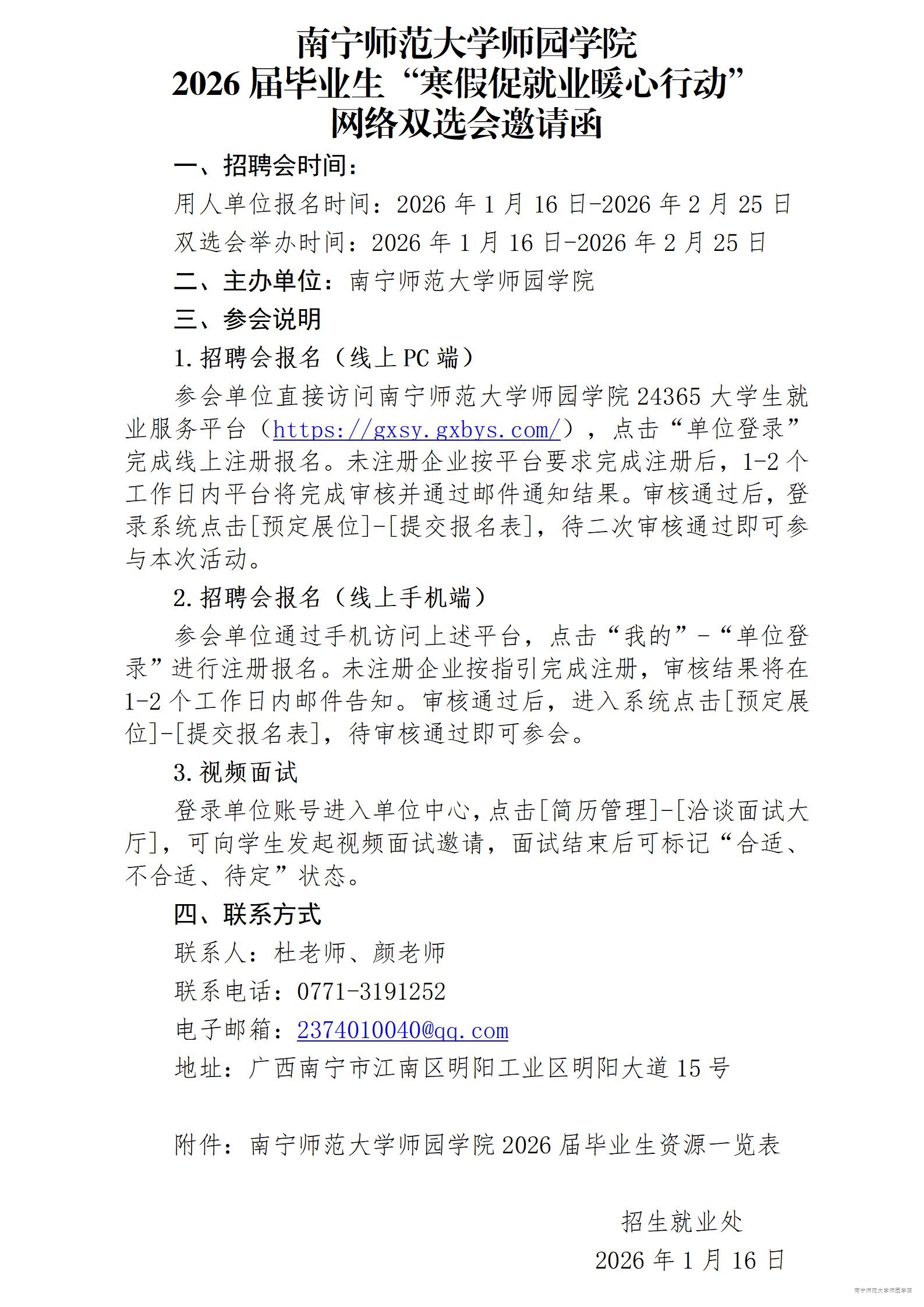 南宁师范大学师园学院2026届毕业生“寒假促就业暖心行动”网络双选会邀请函