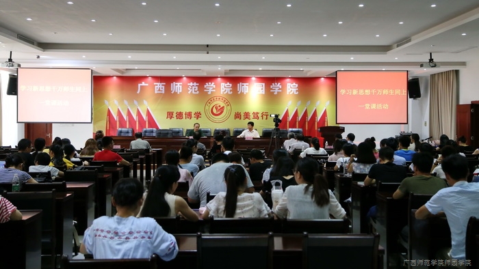 为进一步深入学习贯彻习近平总书记在北京大学师生座谈会和纪念马克思诞辰200周年大会上重要讲话精神,6月22日下午,我院“学习新思想,千万师生同上一堂课”讲座活动在图书馆6楼第一报告厅举行。广西师范学院马克思主义学院院长曾令辉教授应邀主讲。全体学院领导、中层干部、党总支委员、党支部委员、专任教师、行政兼课人员、辅导员及学生代表一同到场聆听了讲座。