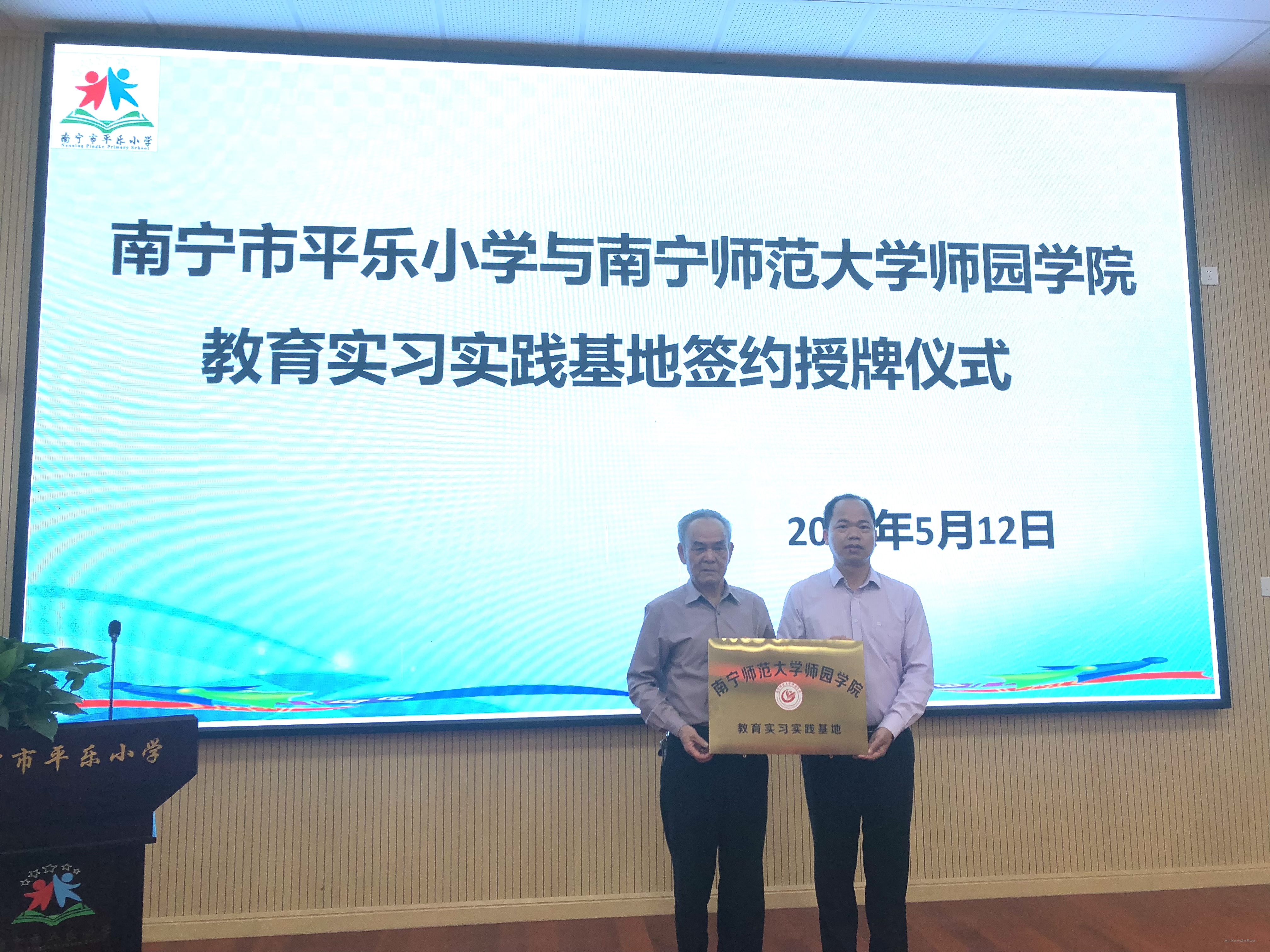 为不断充实我院师范生实习见习平台,推动学院应用型人才培养,5月12日上午,我院在南宁市平乐小学举行教育实习实践基地签约仪式。学院副院长卢敏秋,艺术系主任韩聪与南宁市平乐小学校长黄登兆一行参加签约仪式。