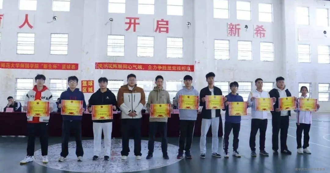 11月20日中午,学校2025级“新生杯”篮球赛颁奖典礼在风雨球馆顺利举行。体育系主任邓朝,裁判长吕文超及各系教师代表、各系运动员代表队参加颁奖典礼。