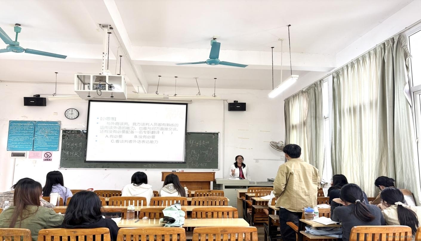 课程教学示范观摩活动是教师们交流互鉴的重要平台。外语系特邀南宁师范大学外国语学院赵琦教授为全系教师带来了一堂精彩且实战性强的《国际商务谈判》教学观摩课。赵老师通过 “即时点评+问题引导”的方式给学生实时指导,巧妙补充专业术语,帮助学生顺畅推进交流,充分展现了商务英语专业学生的语言应用能力与谈判策略素养,将双语表达与谈判逻辑深度融合,有效落实了技能实践课的教学目标。